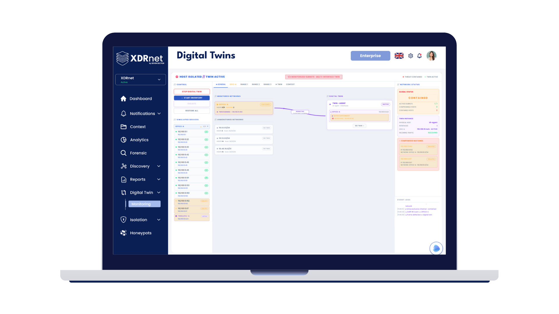 El módulo Digital Twin de XDRnet crea una réplica virtual aislada de la red donde es posible observar y contener la actividad del atacante sin afectar la infraestructura real.